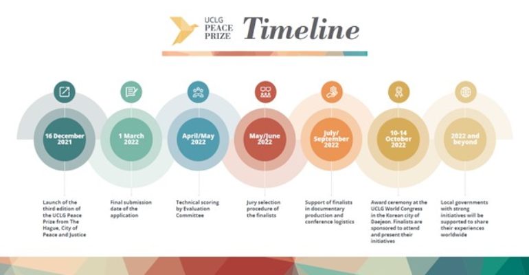 Submitting your initiative is very easy,using the application form that can be found here, or at the Peace Prize website. You will be asked to describe the initiative of your local government in a maximum of 500 words. The deadline for submission is the 1st of March. After a technical scoring by the evaluation committee, the jury will select five finalists who will be invited to make a documentary about their initiative which will be shared during the UCLG World Congress in Deajeon in October 2022. The finalists will be sponsored to present their peace initiatives during this congress that will also feature the award ceremony. The winning local government will receive a prize package of €20.000 to strengthen its initiative or facilitate exchange with other local governments.